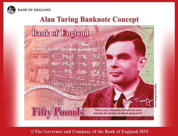 Uang kertas 50 poundsterling baru akan menampilkan gambar Turing berdasarkan foto tahun 1951, serta elemen-elemen yang berkaitan dengan karyanya: